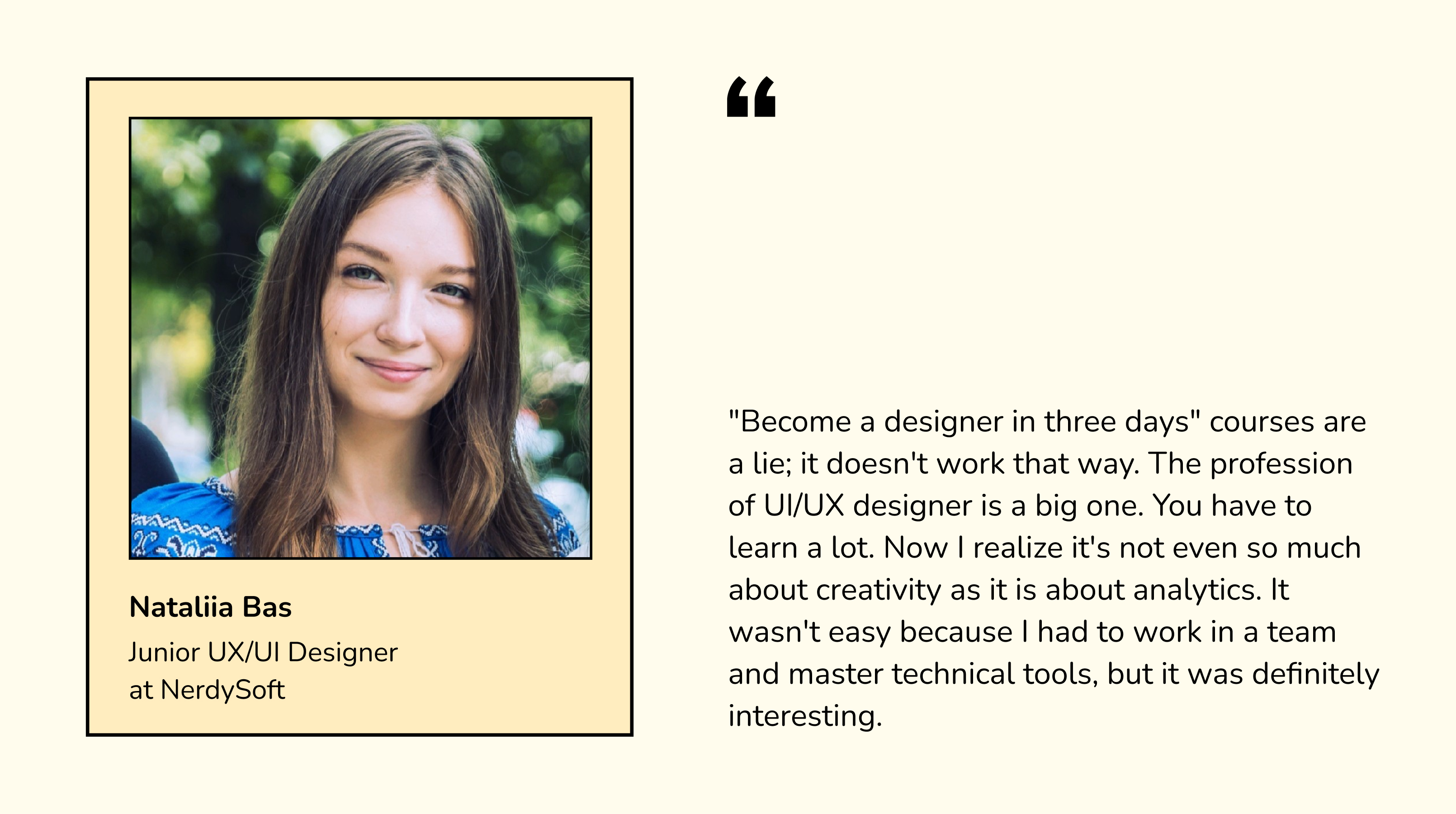 Thanks to the Academy, I also improved my resume and learned how to write cover letters to make my CV stand out. I also found a non-profit project in the alumni chat that I joined. Participation in such projects is an excellent option for beginners to gain experience and expand their portfolio. In fact, at the interview for my current job, I showed two of my works: the final team project from the course and the non-profit. All the knowledge I gained during and after my studies helped me to get the coveted job offer. So now I work as a Junior UI/UX Designer at Nerdysoft.